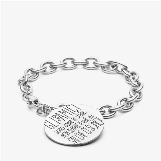 Bracciale catena grumetta maglia larga in acciaio inossidabile con medaglia a forma di cuore pendente d’acciaio con incisa frase emozionale. Il bracciale ha una chiusura in acciaio inossidabile di colore argentato. Misura standard di 18cm e dispone di una prolunga finale di 3cm.