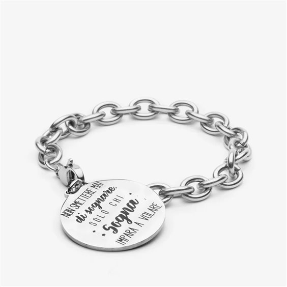 BRACCIALE CATENA EMOTION H SILVER Bracciale catena grumetta maglia larga in acciaio inossidabile con medaglia a forma di cuore pendente d’acciaio con incisa frase emozionale. Il bracciale ha una chiusura in acciaio inossidabile di colore argentato. Misura standard di 18cm e dispone di una prolunga finale di 3cm.