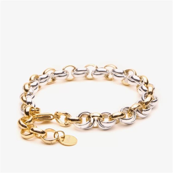 Bracciale Rondella Catena Bicolor Mix Il bracciale è realizzato con una lavorazione a catena in rondelle in alluminio di colore dorato e colore argentato alternati, montate su base di catena in acciaio inossidabile con chiusura moschettone in acciaio inossidabile. La misura è standard di 18 cm con prolunga finale di 3cm.