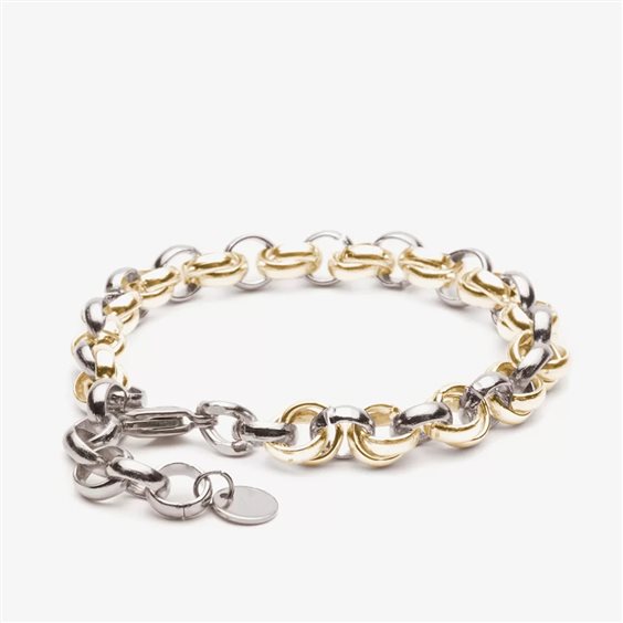 Bracciale Rondella Catena Bicolor Mix Il bracciale è realizzato con una lavorazione a catena in rondelle in alluminio di colore dorato e colore argentato alternati, montate su base di catena in acciaio inossidabile con chiusura moschettone in acciaio inossidabile. La misura è standard di 18 cm con prolunga finale di 3cm.