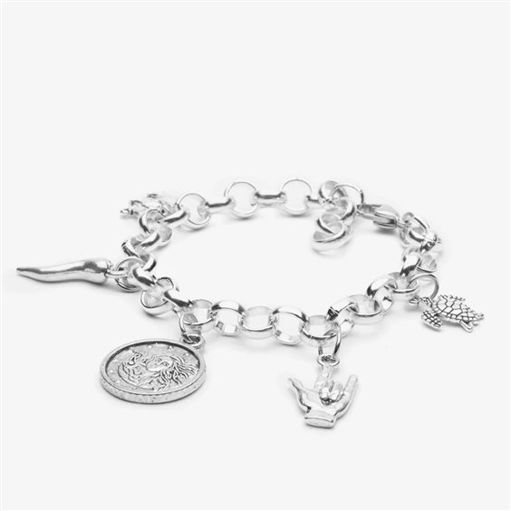 BRACCIALE RONDELLA CHARMS GOOD SILVER Bracciale catena rondella in alluminio di diametro interno 8mm con applicazione di ciondoli pendenti in acciaio inossidabile a tema fortuna. Il bracciale ha una chiusura con moschettone in acciaio inossidabile argentato. Misura standard 20cm poiché comprensiva di allugamento di 3cm.