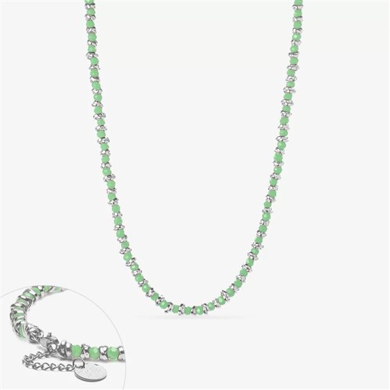 Collana di cristalli di 3mm montati su filo metallico alternati con rondelle in alluminio con chiusura in acciaio inossidabile. Lunghezza standard 45 cm più 5 cm di prolunga finale.
