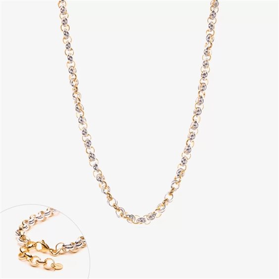 Collana Rondella Catena Bicolor Mix La collana è realizzata con una lavorazione a catena in rondelle in alluminio di colore dorato e colore argentato alternati, montate su base di catena in acciaio inossidabile con chiusura moschettone in acciaio inossidabile. La misura è standard di 45 cm con prolunga finale di 5cm.