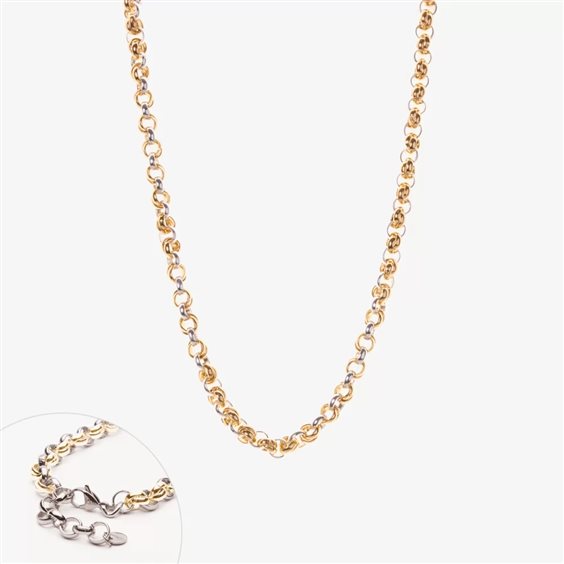 Collana Rondella Catena Bicolor Mix La collana è realizzata con una lavorazione a catena in rondelle in alluminio di colore dorato e colore argentato alternati, montate su base di catena in acciaio inossidabile con chiusura moschettone in acciaio inossidabile. La misura è standard di 45 cm con prolunga finale di 5cm.