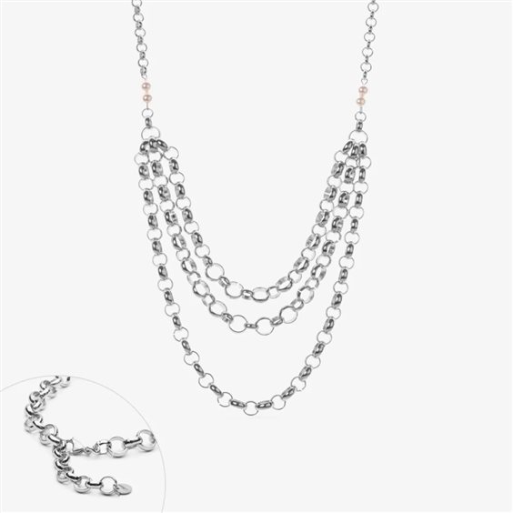 Collana Rondella Imperial Multigiro Collana catena rondella di misure miste in alluminio composta da vari giri di catena. La lunghezza della catena del giro più corta è di 45cm, la lunghezza del giro più lungo è di 65cm. La collana ha una chiusura in acciaio inossidabile.