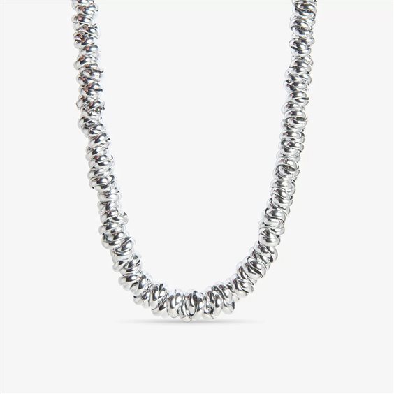 Collana con rondelle in alluminio di colore gold o silver montate su una base di acciaio inossidabile con chiusura in acciaio inossidabile. Lunghezza standard 45 cm più prolunga finale.