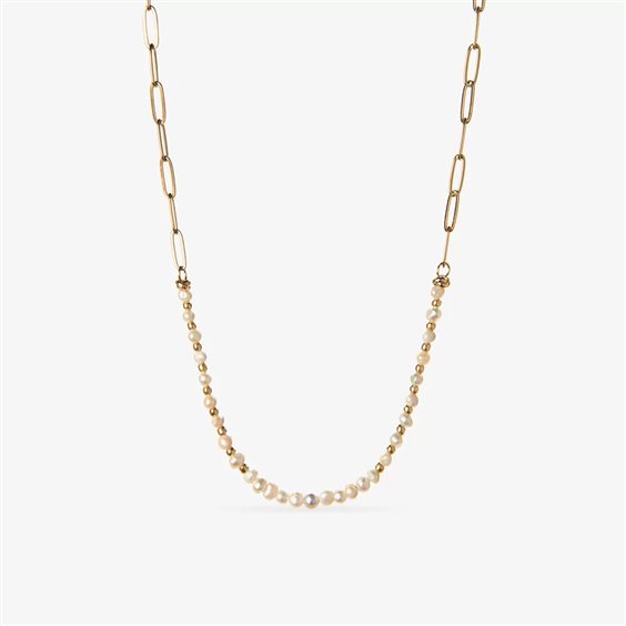 Collana di perle sintetiche di forma irregolare piccole alternate a conteria e catena rettangolare in acciaio inossidabile. Misura standard 45 cm più 5 cm di prolunga finale per regolarne la circonferenza