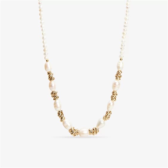 Collana alternata a perle grandi e piccole e rondelle in alluminio su filo metallico con chiusura in acciaio inossidabile.