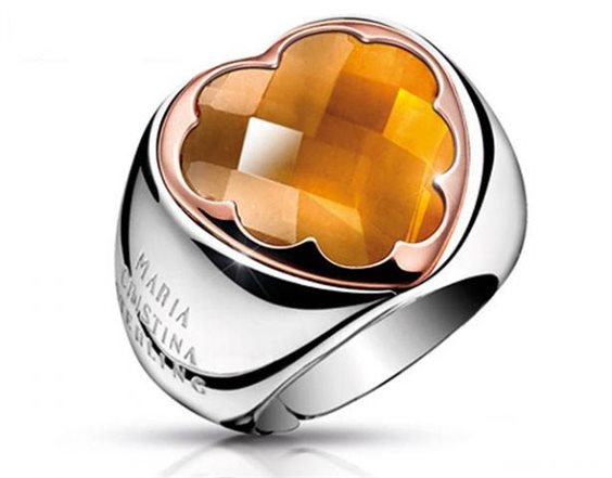Anello della collezione Quarzi realizzato in argento rodiato e rosa 925, con centrale a forma di cuore impreziosito dalla pietra citrino