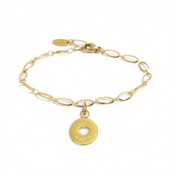 Bracciale in acciaio pvd oro con catena mista ovale e rotonda con pendente con moschettone tondo a medaglietta con diametro 1,2 cm con cuore forato al centro. Sulla parte frontale incisa la scritta "sei unica". Sul retro incisa la scritta "Nel mio" sopra il cuore forato. La chiusura è con una texture a righe e logo Marlù incisi. Lunghezza totale 19 cm.