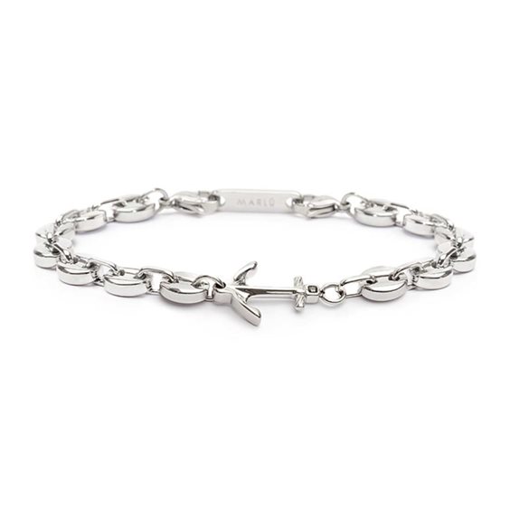 Bracciale in acciaio con catena marine con centrale a forma di ancora con elemento con texture e cristallo nero. Lunghezza totale 21 cm, regolabile da 21 a 19 cm tramite logo tag Marlù in acciaio removibile. Materiali: acciaio, cristallo