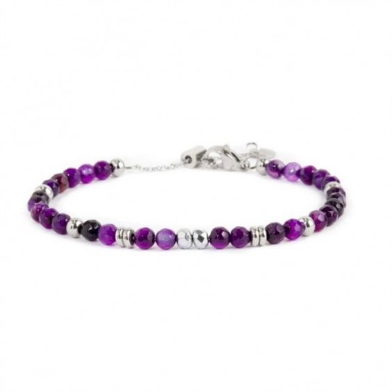 Bracciale in acciaio con catena box rounded con sfere di agata viola sfaccettate con dimensione 4,35*4 mm alternate ad elementi di acciaio e di ematite sfaccettata. Lunghezza totale 19 cm, regalabile tramite cursore da 19 cm a 16 cm.
