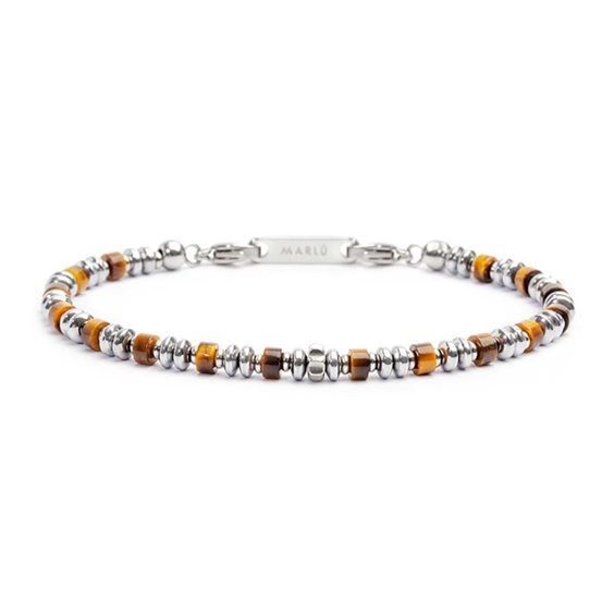 Bracciale in acciaio con rondelle in pietra alternati ad elementi in ematite ed acciaio. Al centro una rondella diamantata. Lunghezza totale 21 cm, regolabile da 21 a 19 cm tramite logo tag Marlù in acciaio removibile.