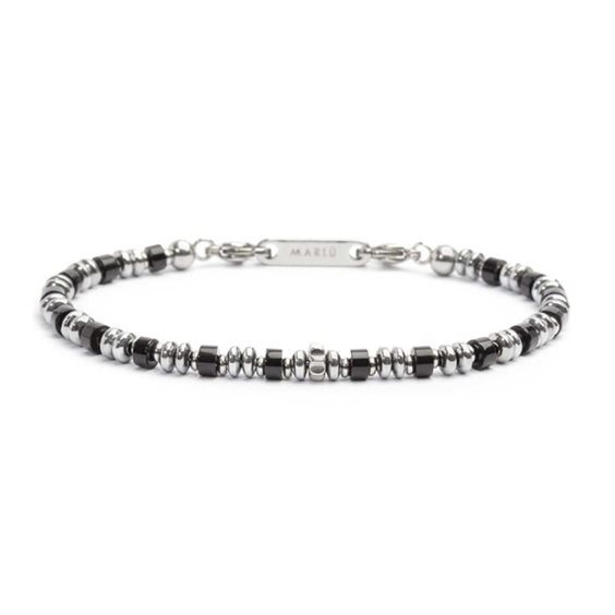Bracciale in acciaio con rondelle in pietra alternati ad elementi in ematite ed acciaio. Al centro una rondella diamantata. Lunghezza totale 21 cm, regolabile da 21 a 19 cm tramite logo tag Marlù in acciaio removibile.