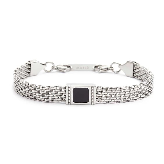 Bracciale in acciaio con catena mesh con centrale in onice all'interno di un elemento in acciaio quadrato con texture laterali. Materiali: acciaio, onice Lunghezza totale 21 cm, regolabile da 21 a 19 cm