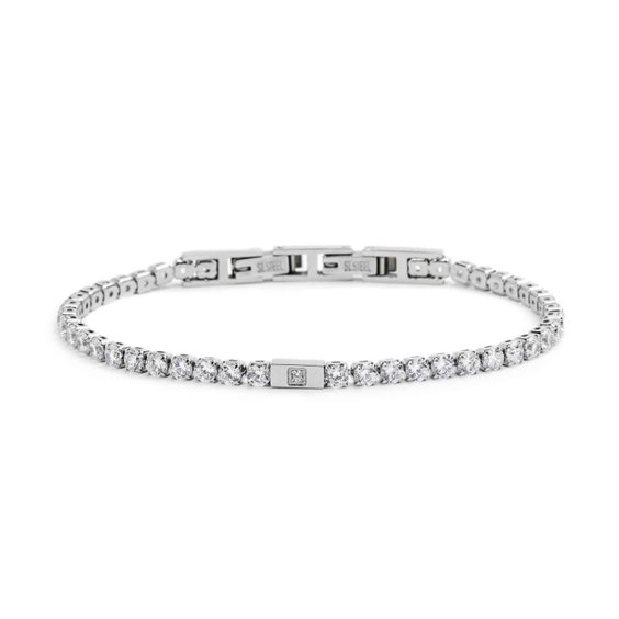 Bracciale con catena tennis con cubic zirconia con diametro 3 mm. Al centro una placca in acciaio con cubic zirconia al centro