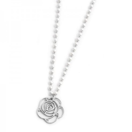 Collana in acciaio con catena con perle. Al centro un pendente a forma di rosa traforata con sopra cristalli bianchi. Lunghezza totale 50 cm regolabile tramite cursore da 50 cm a 40 cm.