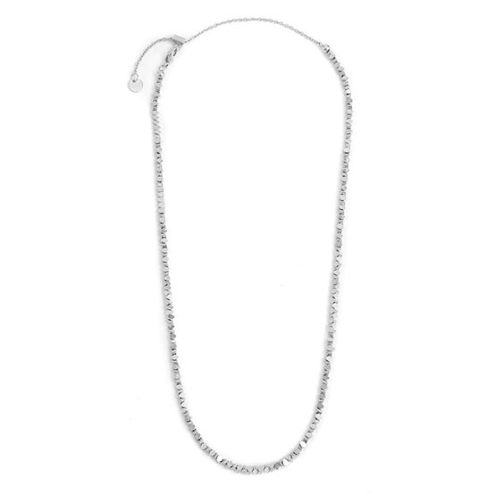 Collana in acciaio ed ematite con forma diagonale cromata. Lunghezza totale 50 cm, regolabile tramite cursore da 50 cm a 40 cm. Marlù logo tag all'estremità. Materiali: acciaio, ematite cromata