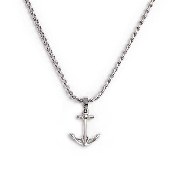 Collana in acciaio con catena twisted serpentine con ancora pendente con elemento con texture e cristallo nero. Lunghezza totale 50 cm, regolabile da 50 a 48 cm tramite logo tag Marlù in acciaio removibile.