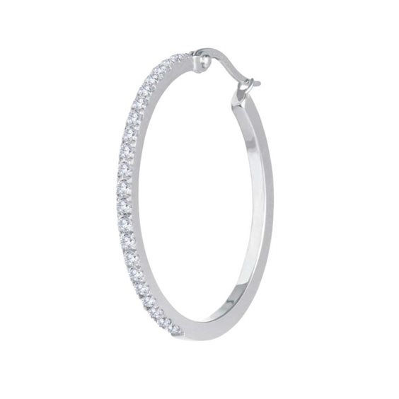 Mono orecchino in acciaio a cerchio 32 mm di diametro con cubic zirconia bianchi. Logo Marlù laserato sulla chiusura. Materiali: acciaio, cubic zirconia