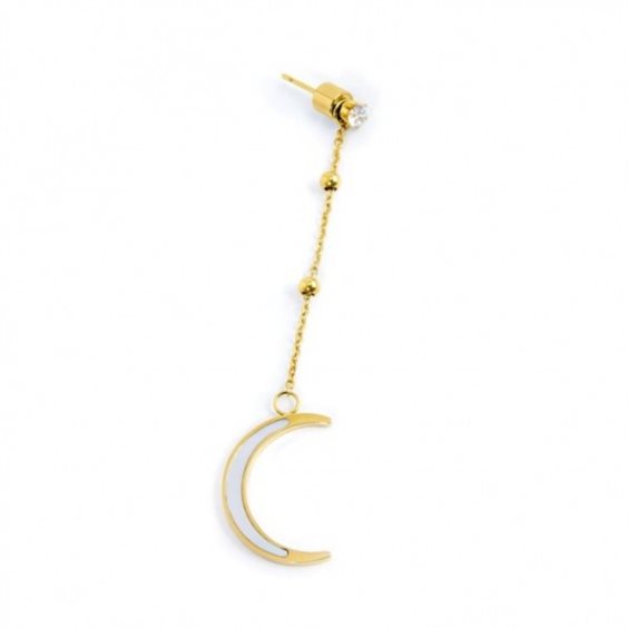 Mono orecchino in acciaio con PVD oro con cristallo bianco e con catena cross con sfere in acciaio. Pendente removibile con luna in madreperla. Lunghezza totale 59 mm. Chiusura in acciaio con PVD oro con silicone con logo Marlù. Collezione: Vision