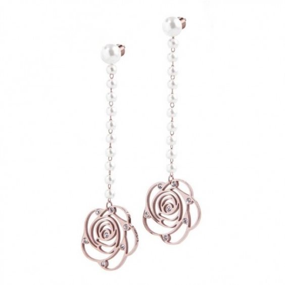 Paio di orecchini in acciaio pvd rosè con perla e con catena pendente con perle con rosa traforata con cristalli bianchi sul cui bordo è laserato il logo Marlù. Il pendente è removibile. Lunghezza totale 6,8 cm