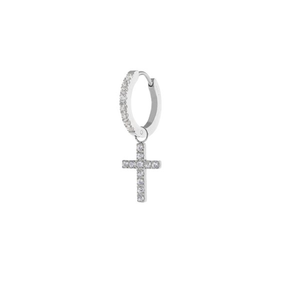 Mono orecchino in acciaio a cerchio con diametro 1,6 cm con cubic zirconia bianchi e pendente a forma di croce con cubic zirconia bianchi