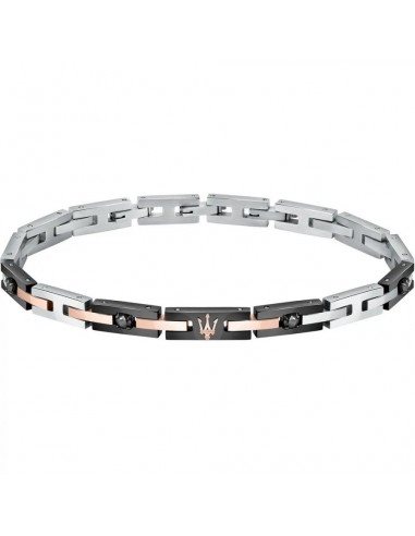 Braccialetto da uomo realizzato in acciaio anallergico con finitura lucida, trattamento ip nero e dettagli placcati oro rosa. Logo su elemento centrale. Inserti con zirconi neri. Misura regolabile; chiusura con maglie rimovibili.
