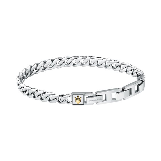 Braccialetto da uomo realizzato con catena groumetta in acciaio anallergico con finitura lucida. Logo dorato su elemento laterale. Misura regolabile; chiusura con maglie rimovibili.