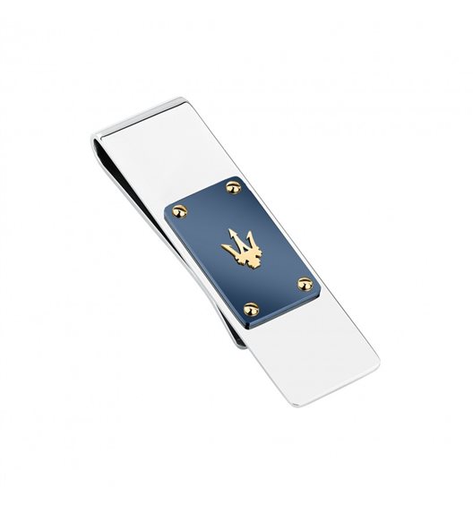 Fermasoldi realizzato in acciaio inox con centrale blu e logo dorato.
