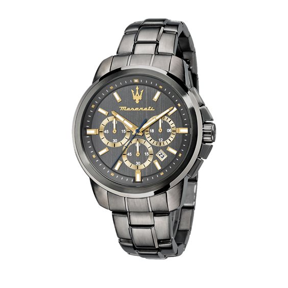 Orologio Maserati uomo cronografo di colore grigio fumo. Anche il quadrante è coloro grigio con lancette e dettagli color oro. Dimensione cassa 47mm. Water resistant 5 Atm.