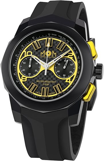 Cassa in acciaio, diam. 46 mm Cinturino in silicone personalizzato Movimento cronografico al quarzo di precisione Vetro minerale Waterproof 50m (5 atm) Corona e fondello a vite