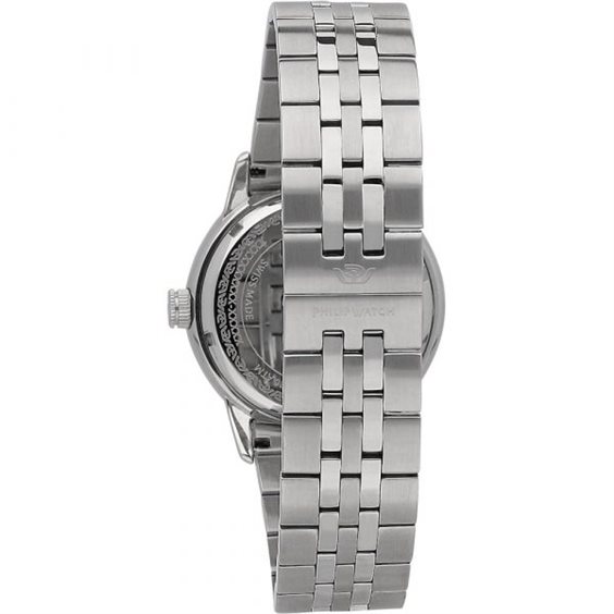 Orologio uomo della collezione ANNIVERSARY con movimento al quarzo, Water resistant 10ATM. Cassa acciaio inox lucido da 40mm con fondello a vite. Vetro minerale con trattamento zaffiro antigraffio. Quadrante nero con numeri romani alternati ad indici e con datario ore 3. Bracciale acciaio lucido e satinato, chiusura a farfalla. Garanzia 2 anni Philip Watch.