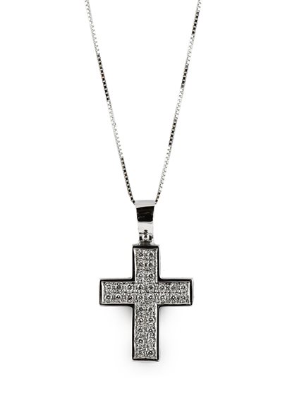 Girocollo in oro bianco 18 kt. con pendente a forma di croce in oro bianco 18 kt. e pave' di diamanti taglio brillante di kt. 0.174in totale