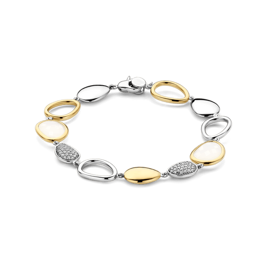 BRACCIALE TI SENTO MILANO IN ARGENTO 925 Realizzato in argento sterling 925, il gioiello unisce una serie di charm a forma di ciottolo in un'unica linea fluida: una pietra bianco latte taglio fantasy con placcatura in oro giallo, un ciottolo placcato oro lucido, dischi pavé incastonati con brillanti zirconi cubici bianchi e dettagli traforati e placcati platino che creano un arioso spazio negativo