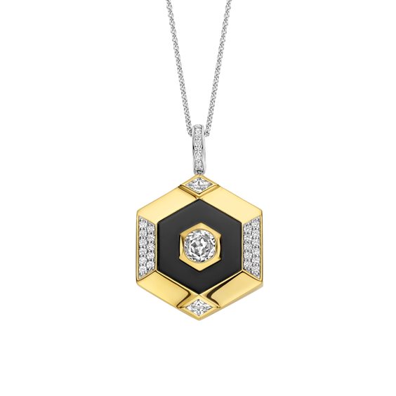 Collana in argento placcato oro 6838BL di TI SENTO. Realizzato in argento sterling 925 e placcato in oro giallo, forma a esagono con una pietra nera e zirconia cubica intorno al bordo.