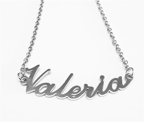 Collana in acciaio con nome Valeria, lunghezza del nome 5cm, lunghezza catenina di 48cm, regolabile da 43cm a 48cm.