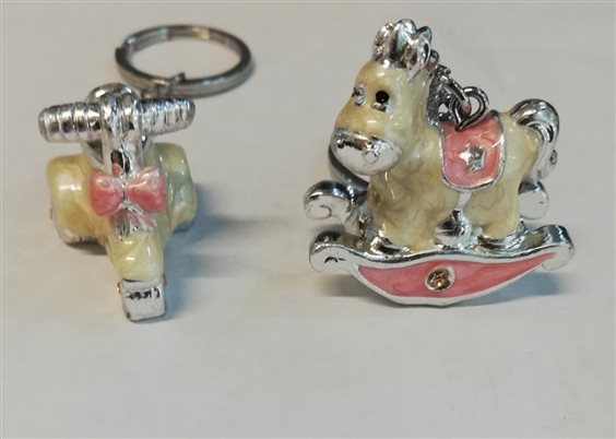 BOMBONIERA BATTESIMO BIMBA/BIMBO - -STOCK DA 23 PZ -PORTACHIAVI CAVALLUCCIO A DONDOLO (MISURA: ALTEZZA E LARGH. CM 3,5) - PORTACHIAVI MOTO (MISURA: ALTEZZA E LARGH. CM 3)