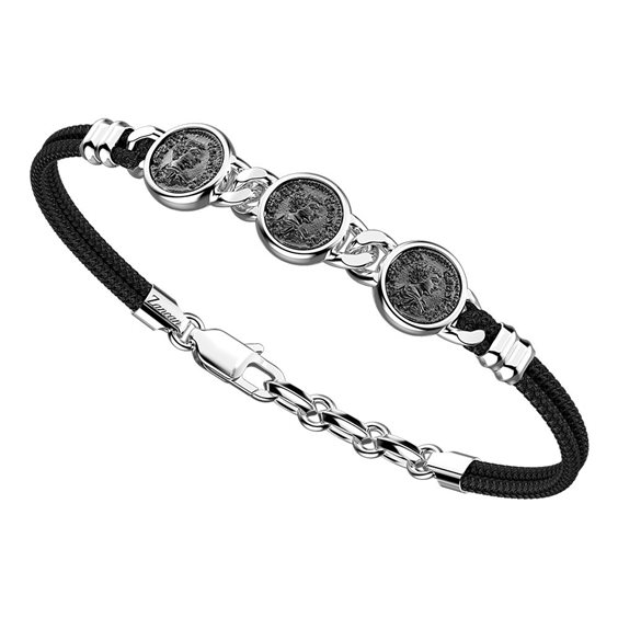 Bracciale in kevlar e argento con monete. Chiusura in acciaio.