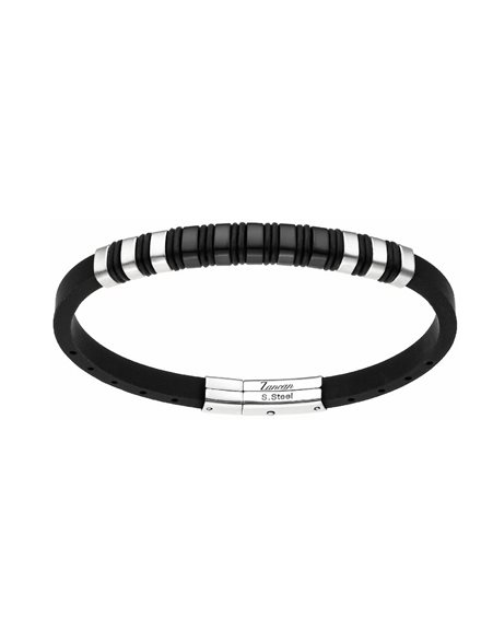 Bracciale della collezione Zancan Hiteck da uomo. Colore: argento e nero. Il gioiello è in silicone con elementi alternati in pvd nero e silver, e chiusura in acciaio inossidabile 316L.